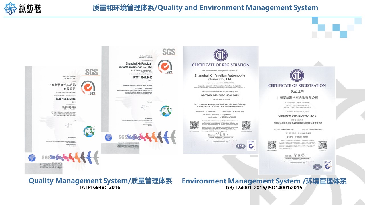 體系證書:通過IATF 16949:2016質量管理系統和ISO 14001:2015環境體系認證